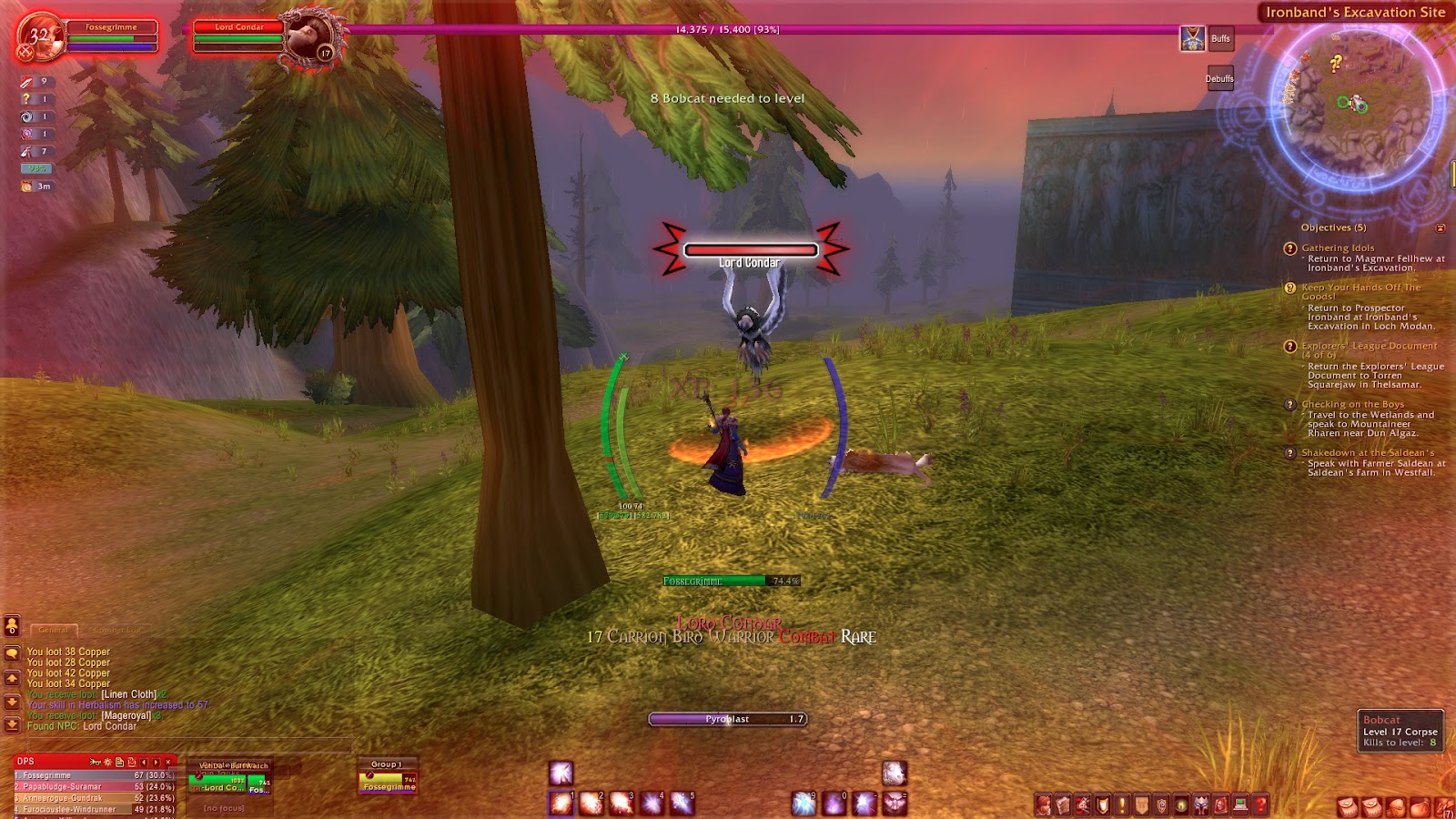 So far I've been amazed by the number of rare spawns in these Alliance zones. I don't think I've ever encountered so many in low-level Horde zones. In the pic above, Lord Condar came swooping down out of nowhere while Fossegrimme was dispatching a bobcat outside of an archaeological dig in Loch Modan.